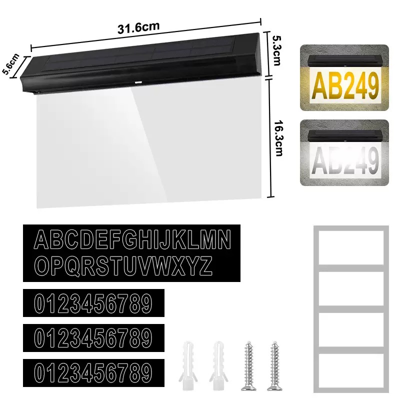 This solar-powered house number light features 30 high-efficiency SMD2835 LEDs, delivering both warm and cold white illumination. Its ABS+PC construction ensures durability, while the IP65 waterproof rating protects it in any weather. With a 2V 400mA solar panel and a 1200mAh battery, it charges in 6–8 hours and provides reliable dusk-to-dawn performance—ideal for homes, apartments, or offices seeking both function and style.